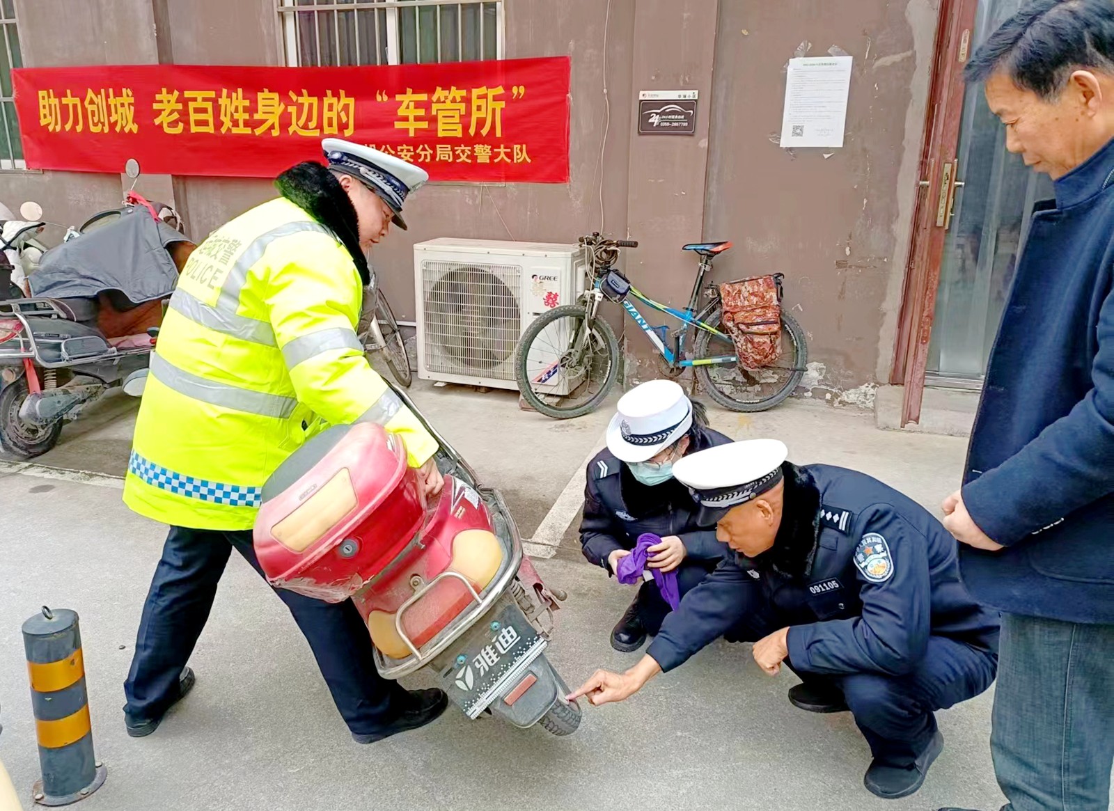 活动中,大队车管所、城区各中队民辅警联合社区义工,在各个社区按照流程,细致审核车辆手续、查验车架号、建档登记、挂牌一气呵成,让群众电动车牌照不跑腿,提升群众的获得感和幸福感。
