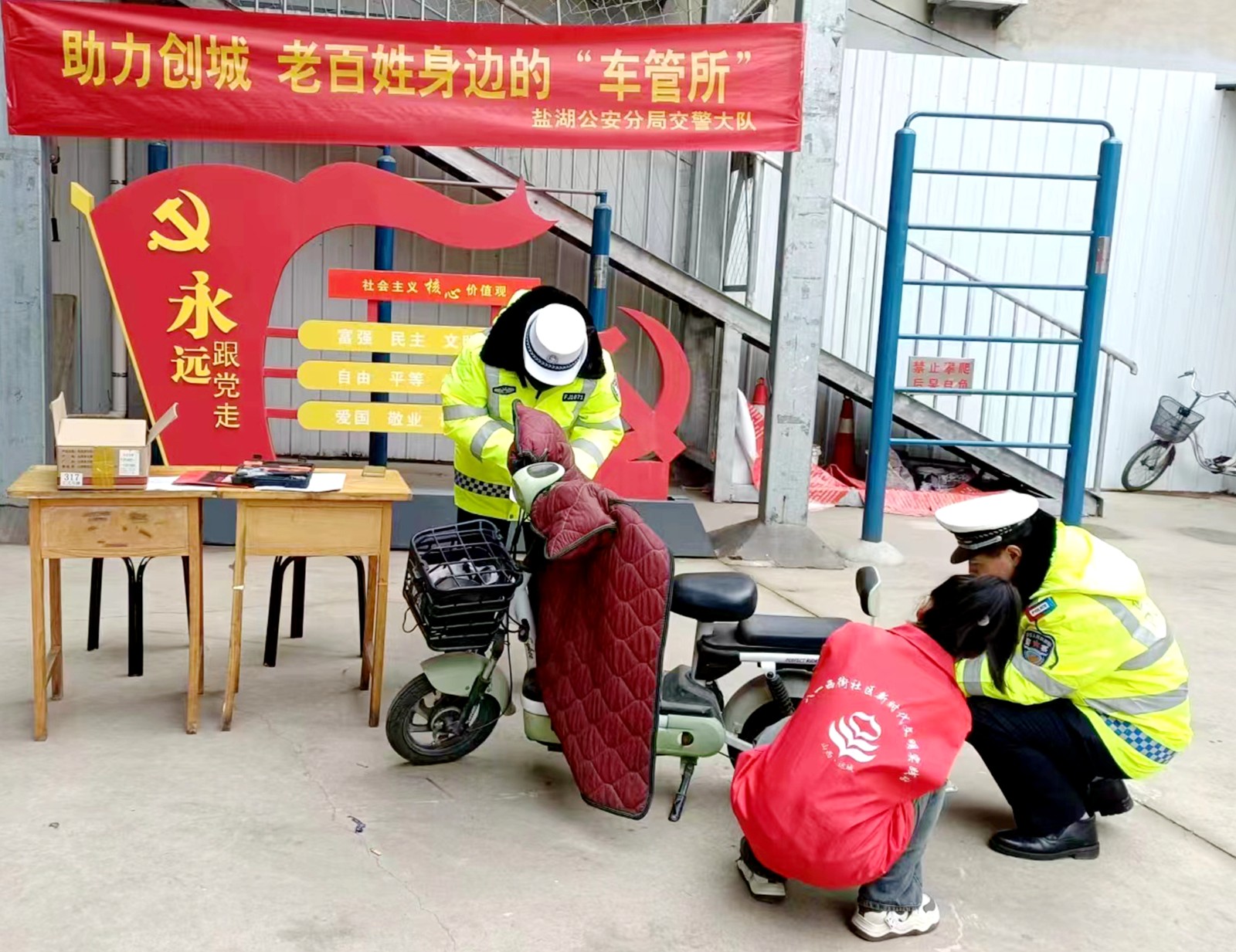 图为当日,大队车管所、城区各中队民辅警联合义工在社区免费为群众办理电动车挂牌业务。