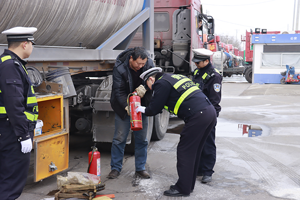 文明山西网讯 近日,祁县公安局交警大队持续加大对危化品运输车辆的检查工作,确保辖区道路危化品运输车辆的运输安全,进一步加强危化品运输车辆的管理力度,预防冬季道路交通事故的发生,为春运营造良好的交通秩序。