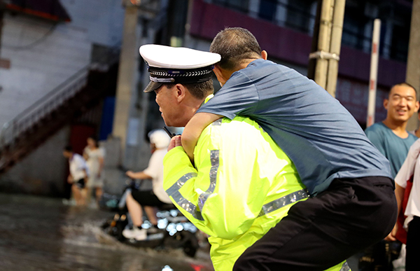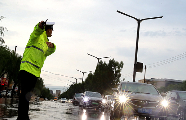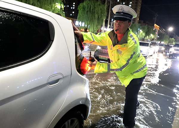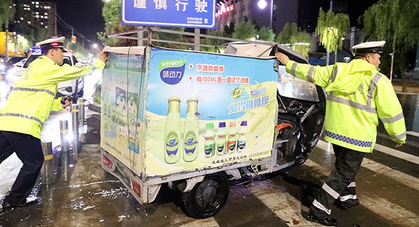 文明山西网讯 7月17日下午,一场暴雨的来临,致使城区部分路段出现积水,给出行的市民带来很大的不便,运城市公安局盐湖分局交警大队按照上级公安机关党委安排部署,第一时间启动恶劣天气交通疏导应急预案,在重点路口、路段和点位增派警力、严防死守,实时调度辖区降水情况和道路通行状况,并对低洼、易积水路段实时巡查管控。针对易积水的重点路段各辖区大队警力加强巡逻,疏通下水管道、清理路障,及时做好交通疏导和避险救援工作,消除道路安全隐患,同时加强路面管控,引导来往车辆有序通行。并积极帮助学生老人淌过积水区,将抛锚车辆推出积水区,确保道路通行安全、守护群众平安出行。图为当日,答对大渠中队正在圣惠路积水路段疏导并开展爱心帮扶。