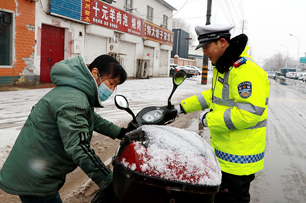 文明山西网讯 1月25日,临近春节,山西运城市盐湖区迎来强雨雪天气,为积极应对降雪天气,运城市盐湖区公安局交警大队以雪为令,迅速启动恶劣天气交通管理应急处置预案、细化勤务部署、强化应急保障,维修交通设施,全力以赴,保障恶劣天气下道路交通安全。全员上路坚守在执勤一线,坚决做好雨雪冰冻天气道路疏堵保畅工作,同时开展爱民便民服务,树立交警良好形象,全力以赴确保辖区群众出行平安。图为当日大队民警在市区主要路口冒雪值守保畅通,同时维修交通设施和开展爱民服务。