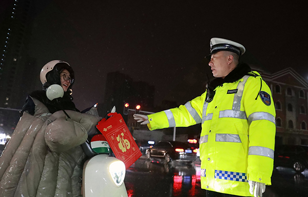 文明山西网讯 1月24日,运城市盐湖区迎来2025年首场大范围雨夹雪,气温骤降,道路湿滑。为积极应对此次降雪天气对辖区交通安全带来的不利影响,保障人民群众春运出行安全,运城市盐湖区公安局交警大队民警以雨雪为令,闻令而动,全力做好雨雪冰冻天气保安全保畅通工作。雨雪夜,民警不畏严寒,坚守岗位,加强对辖区商超、农贸市场、主要交通路口重点巡逻值守力度,通过喇叭喊话、开启警灯等措施,提醒驾驶员减速慢行,与前车保持安全距离,提高驾驶员恶劣天气下的应急能力,有效预防和减少交通事故的发生,为人民群众顺利返乡、欢度佳节创造良好的道路交通环境。图为当晚大队六中队和大渠中队民警在市区拖厂岗和圣惠北路冒着雨夹雪天气值守保障路面畅通有序。