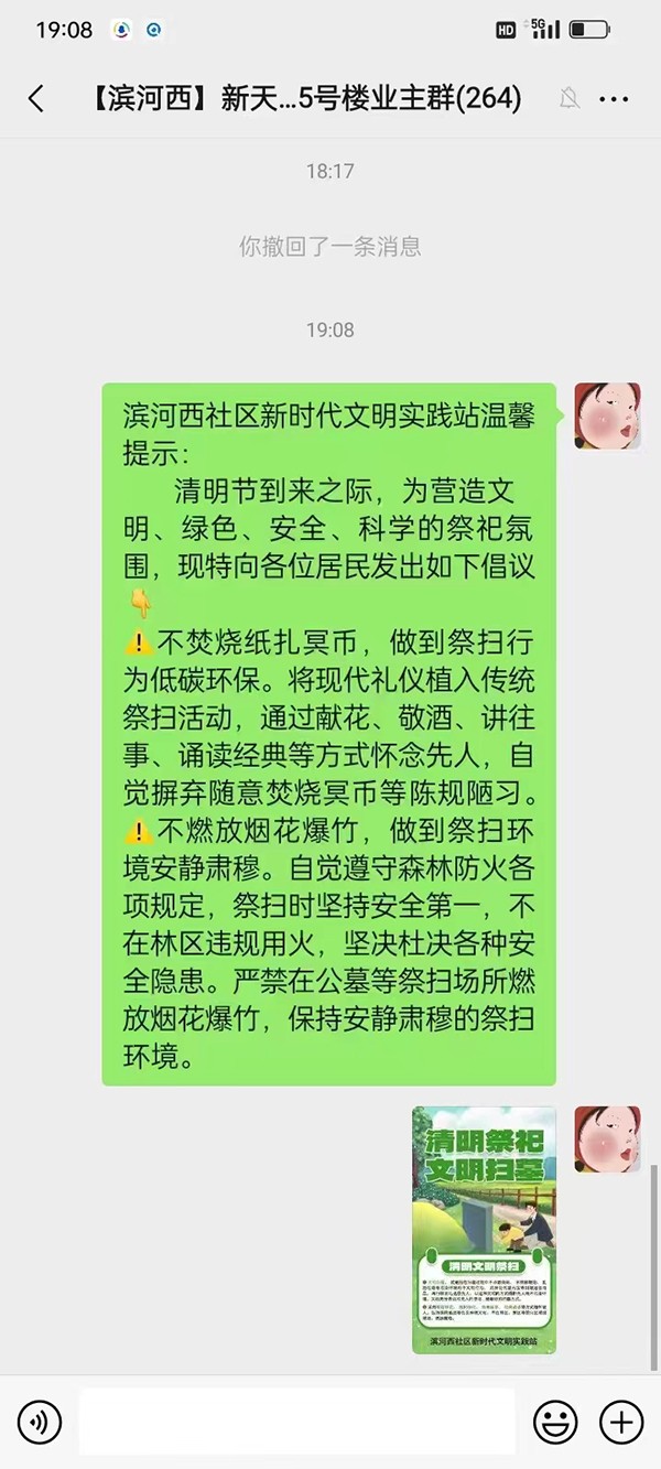 活动利用线上、线下相结合的宣传方式进行。线上,在微信群转发、号召居民争做移风易俗的先行者、文明祭祀的引领者,倡导居民采取鲜花祭扫、网络祭扫、家庭追思、踏青遥祭等健康方式缅怀亲人、寄托哀思;线下,志愿者向居民发放“文明祭祀倡议书”,讲解焚烧纸钱冥币、使用违规丧葬用品等祭扫方式在污染环境、安全隐患、铺张浪费等方面的不利影响,倡导居民转变观念,摒弃不文明祭扫行为,安全祭祀、节俭祭祀,树立厚养薄葬的新观念。