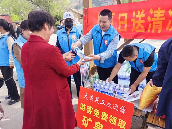 灵丘县委宣传部组织平型关义工联、龙门爱心公益团、百灵鸟艺术团的志愿者们,前往灵丘县重点旅游景区觉山景区、桃花山景区、平型关大捷景区,为游客免费提供矿泉水。