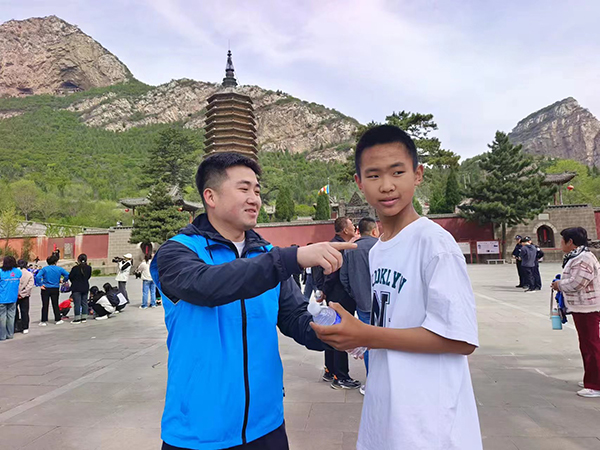 在景区内,游客络绎不绝,志愿者们不仅为游客发水,还热情地提供交通指引、游玩攻略、食宿推荐等咨询服务,积极推介灵丘旅游景点,让游客们有宾至如归的感觉。