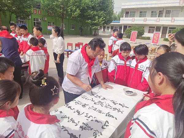 活动中,来自该县教育系统、县书法教育研究会、县毛笔书法分会的李建平、李建法、秦铁牛、张管州、李增科等多位“五老”人员,立足各自实际,发挥自身优势,为全校师生作了题为《缅怀毛主席丰功伟绩,学习毛泽东崇高精神风范,争做新时代合格接班人》的演讲,并朗诵和讲解了毛泽东《七绝•咏蛙》《西江月•井冈山》《七律•人民解放军占领南京》《沁园春•雪》等多首诗词,讲述了诗词中所体现的毛主席的崇高精神风范,现场书写了20余幅各种规格、书体的毛主席诗词和题词,让师生们深切感受到了毛泽东同志崇高的思想精神和伟大的领袖风范。