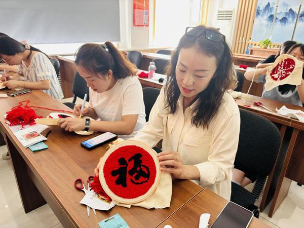在杨庆燕的指导下,大家纷纷拿起绣针,以“福、禄、寿、喜”为内容,全神贯注地在绣布上绣出一个个精美的作品。有的选择传统的红色丝线,寓意着喜庆与吉祥;有的则大胆创新,用彩色丝线搭配出独特的风格。参与者们互相交流经验、分享心得,现场气氛热烈而融洽。