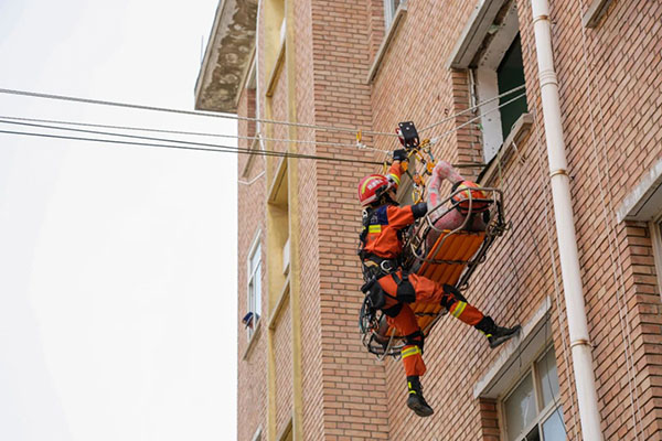 高空负角度绳索救援比赛科目,模拟地震后某建筑严重损毁,楼内无法通行,二楼有人员被困。面对这种情况,消防指战员迅速开展安全评估、制定救援方案、搭建保护站和绳索系统,通过绳索悬垂实施横向破拆救援,并将伤员转运到指定位置。