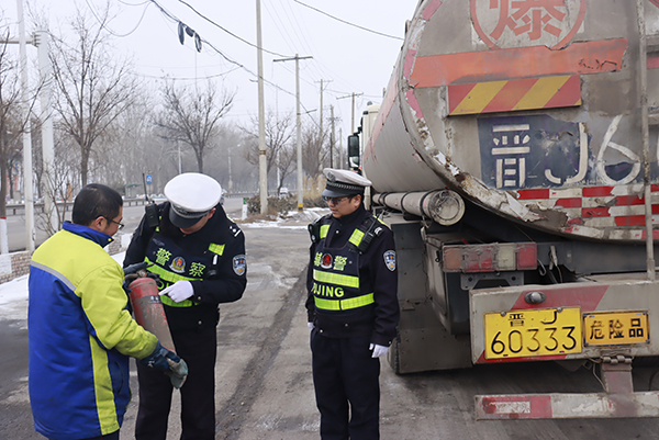 文明山西网讯 近日,祁县公安局交警大队持续加大对危化品运输车辆的检查工作,确保辖区道路危化品运输车辆的运输安全,进一步加强危化品运输车辆的管理力度,预防冬季道路交通事故的发生,为春运营造良好的交通秩序。