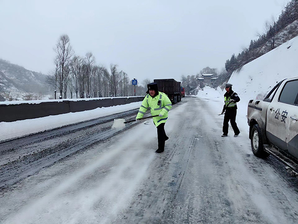 20日,杜村中队安排轮班巡逻,通过闪警灯、鸣警笛、喊话等方式提醒指挥,引导车辆减速慢行、保持车距、有序通行。同时提醒过往车辆驾驶员雪天出行要时刻绷紧道路交通安全弦,确保行车安全。
