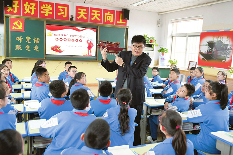 3月17日,稷山县稷王小学党支部书记加志宏在给学生讲解“红船精神”。稷山县中小学把党史学习教育作为思政课的一项重要内容,让学生通过学习党史、讲党史故事、做手抄报等,深刻了解中国共产党的百年奋斗历程和新中国的辉煌成就,进一步增强广大学生的民族自豪感和自信心。栗卢建摄