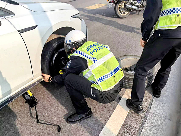 4月6日16时40分,运城市公安局盐湖分局交警大队八中队民警在运城市区中银路与大禹街交叉路口附近执勤时,发现路边一辆白色轿车停在路边,车后放了警示牌,随即上前查看情况,一名女性驾驶员告诉民警其车辆的右前方轮胎不知什么原因没有气了,虽然车上有备胎,但自己不会换胎。了解情况后,执勤交警利用车上的备用工具,娴熟地对车辆故障轮胎进行更换,大约15分钟后,民警更换好备胎后,告诉驾驶员附近的修理厂尽快去更换新轮胎,确保行车安全。驾驶员对执勤交警的热心帮助与暖心叮嘱表示由衷的感谢。