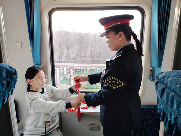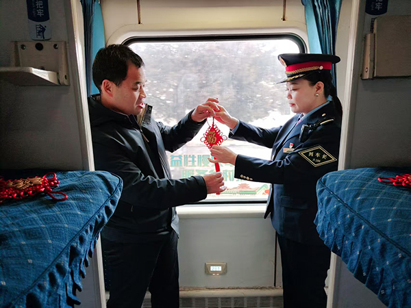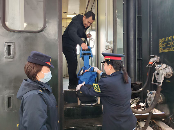 2月4日,太原客运段京津车队8162次1组列车长帮扶重点旅客,为旅客拿大件行李。在列车上为老年人旅客,小朋友旅客送上了新年祝福。